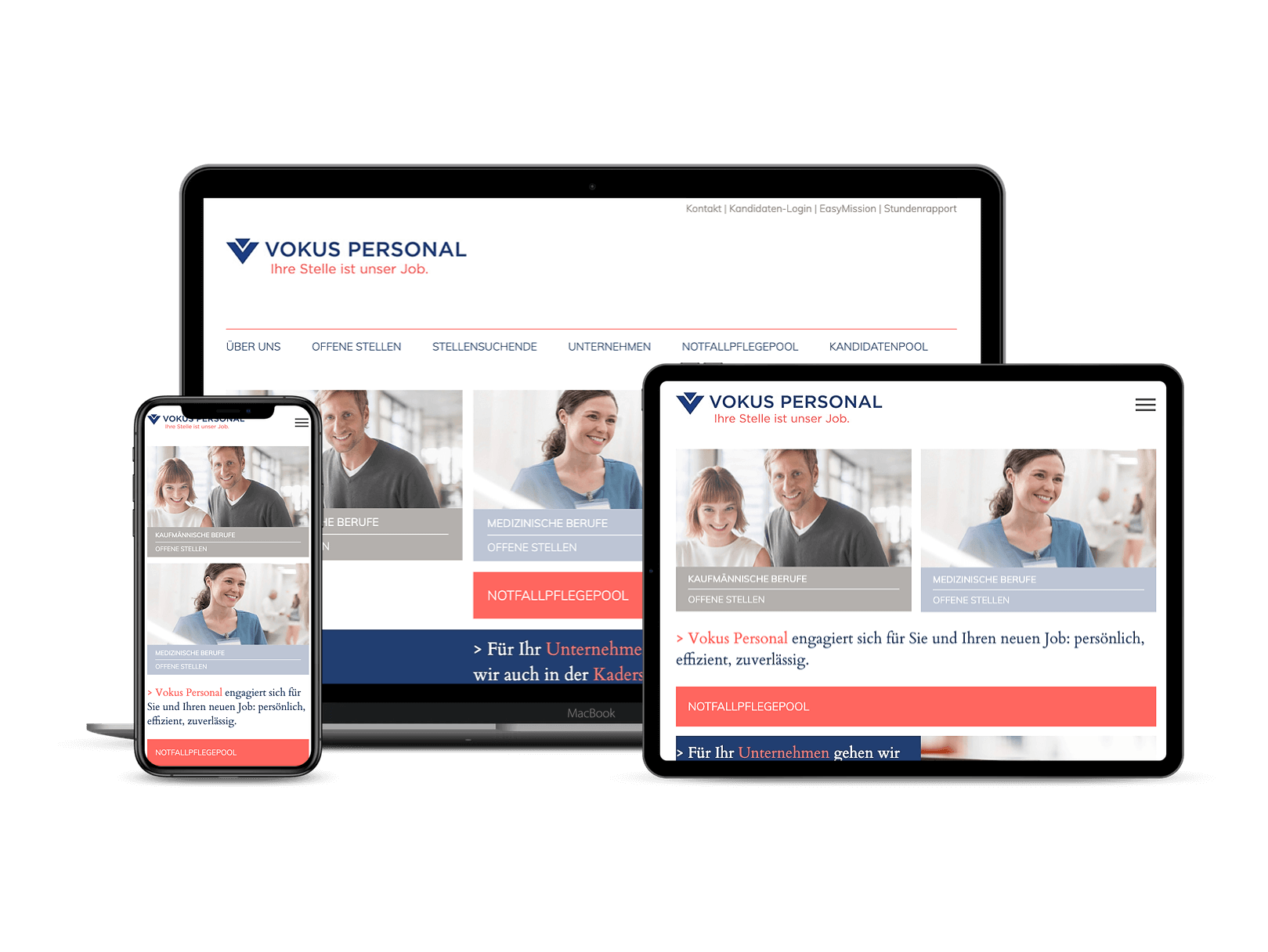 Im Zentrum stehen konsequent die Kunden von Vokus Personal. Die Website bietet ihnen die Möglichkeit, ein Profil zu erstellen, das Vokus Personal AG für die Umsetzung des Vermittlungsauftrages verwendet.